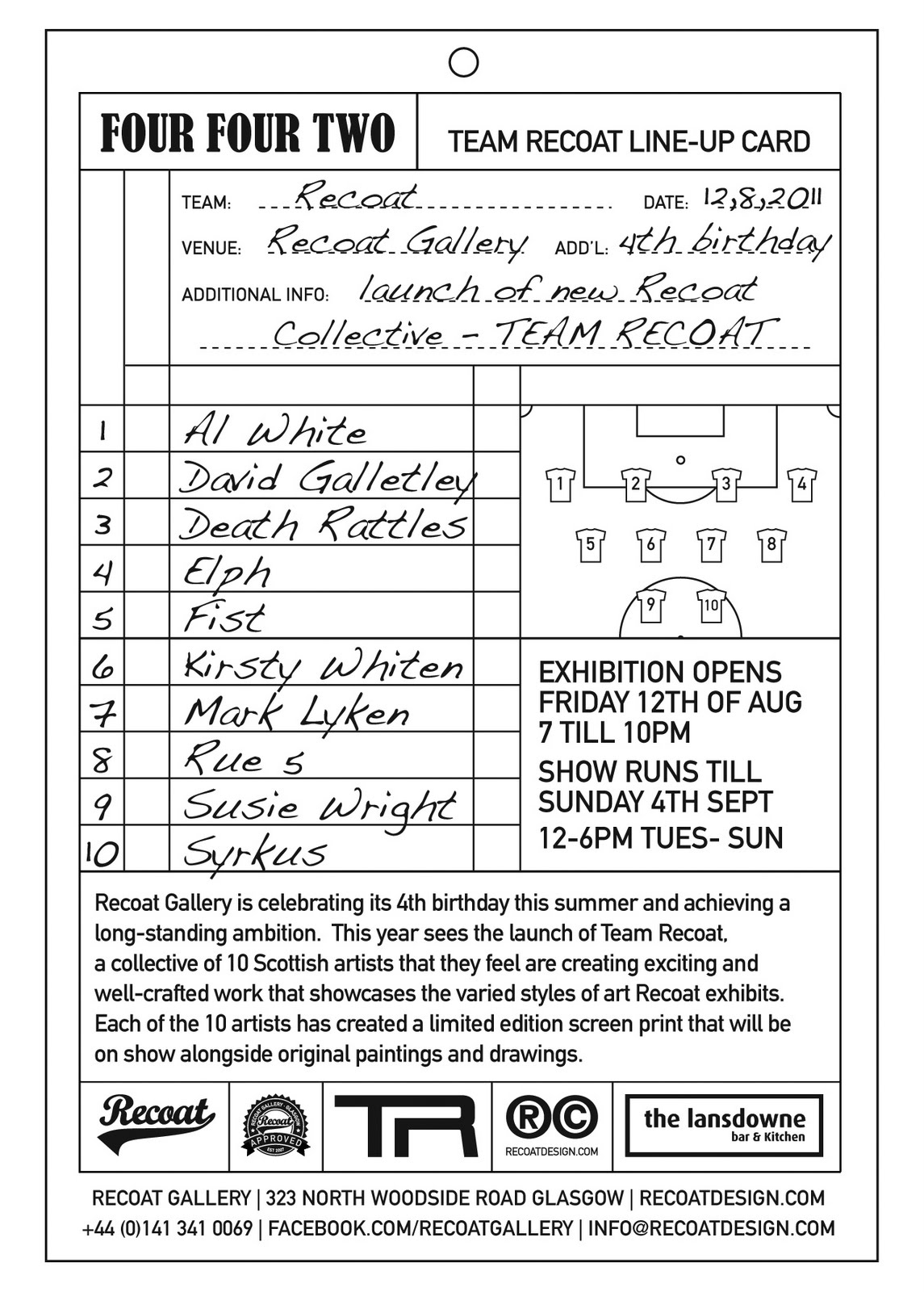- Recoat Gallery exhibits graphic art, illustration, graffiti, street art and photography and sells jewellery, clothing, books and magazines. We showcase work from emerging and established Scottish artists and designers aswell as trying to bring inspirational artists and designers to Scotland from elsewhere.